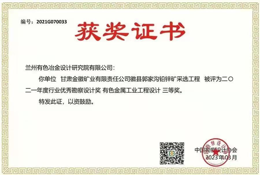 3月1日,中國勘察設(shè)計協(xié)會發(fā)布《關(guān)于公布2021年度工程勘察、建筑設(shè)計行業(yè)和市政公用工程優(yōu)秀勘察設(shè)計獎獲獎項目的通知》(中設(shè)協(xié)字[2023]17號),由蘭州有色冶金設(shè)計研究院有限公司(簡稱:蘭冶院)設(shè)計的金徽股份郭家溝鉛鋅礦項目被評為二〇二一年度行業(yè)優(yōu)秀勘察設(shè)計獎、有色金屬工業(yè)工程設(shè)計三等獎。